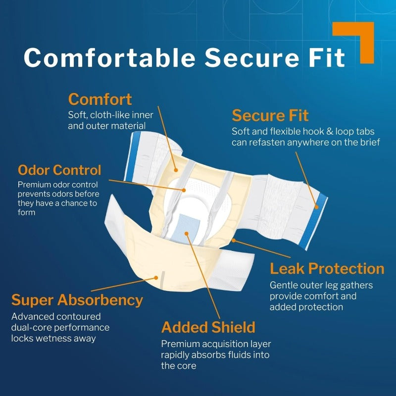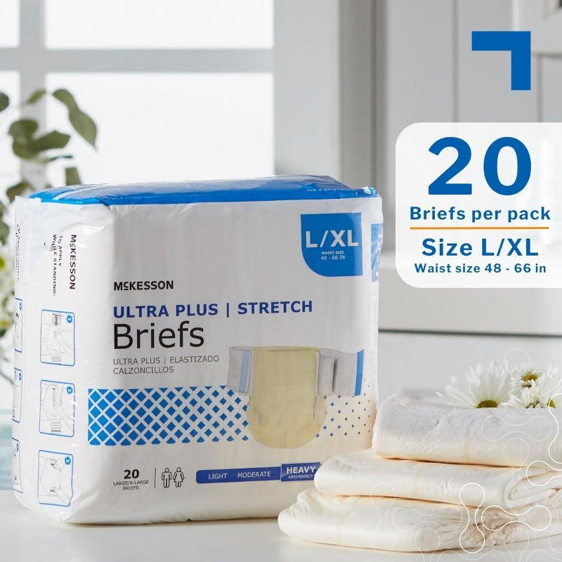 McKesson Ultra Plus Stretch Briefs 80 Count L XL 4866in. Incontinence Adult Diapers Heavy Absorbency Unisex Disposable Elastic Leg Gathers and Contoured Fit for Men and Women, Disposable Undergarments, Adult Care, Comfortable Fit, Stretchable Briefs, Leak